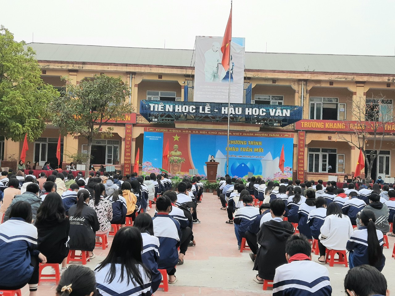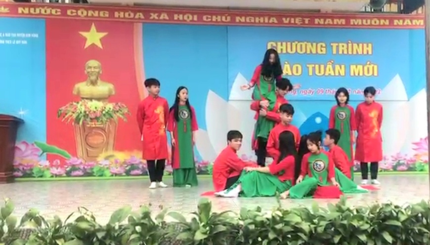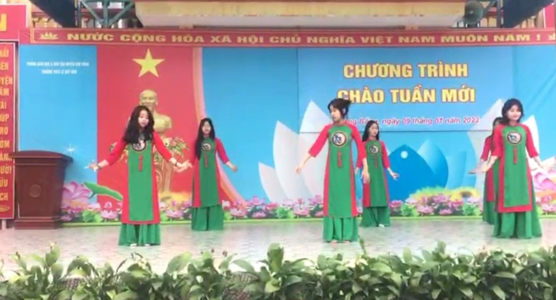 Phần tiếp theo là Chương trình “Chào tuần mới” rất sôi nổi và thú vị do học sinh lớp 8B thực hiện với sự chuẩn bị khá công phu, chu đáo. Mở đầu là tiết mục múa hiện đại đặc sắc trên nền nhạc bài hát “Tát nước đầu đình”. Tiếp theo là phần giao lưu vô cùng hào hứng của 8B với học sinh trên sân trường với các chủ đề về những “Anh hùng lịch sử văn hóa – Danh nhân xứ nhãn Hưng Yên”. Khép lại chương trình là tiết mục hát tập thể bài hát “Hào khí Việt Nam” khơi dậy hào khí thiêng liêng của dân tộc Việt Nam, tạo dư âm khó quên.