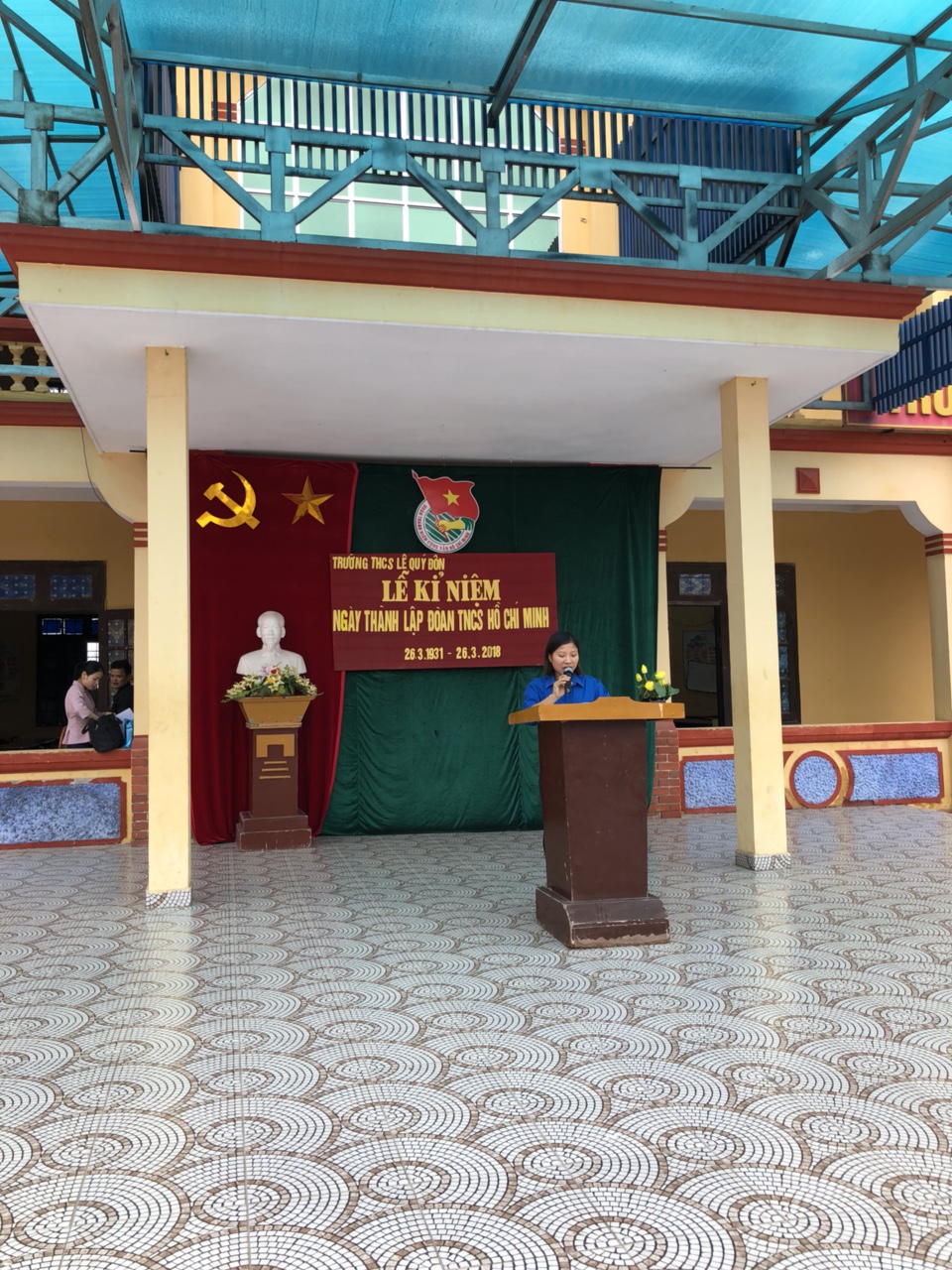 Buổi lễ mít tinh được mở đầu bằng diễn văn kỉ niệm của cô Vũ Thị Điệp -Bí thư Đoàn trường . Diễn văn đã ôn lại một cách ngắn gọn truyền thống của Đoàn THCS Hồ Chí Minh nói chung và Đoàn trường THCS Lê Quý Đôn nói riêng trong suốt những nămqua . Những thành tích nở hoa đó chính là nguồn động lực to lớn để các em tiến bước lên Đoàn.