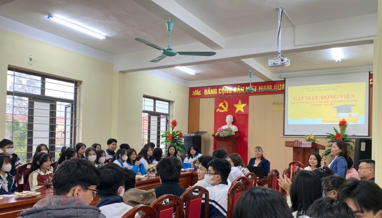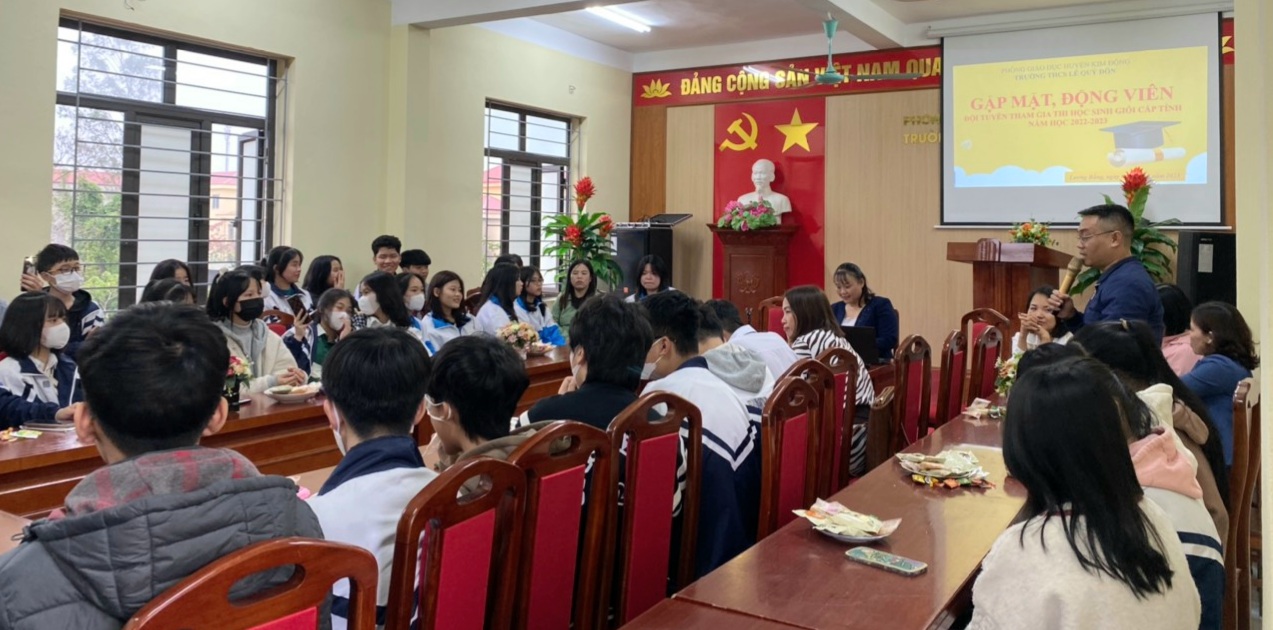 Thực hiện công văn số 2525/SGDĐT-QLCL của SGD ngày 14/12/2022 về Tổ chức Kỳ thi chọn học sinh giỏi cấp tỉnh THCS năm học 2022 - 2023; Thực hiện kế hoạch triển khai nhiệm vụ năm học và kế hoạch tổ chức các hoạt động giáo dục năm học 2022 – 2023, được sự nhất trí của Chi bộ, chiều ngày 4/2/2023, trường THCS Lê Quý Đôn tổ chức buổi Gặp mặt, động viên các đội tuyển tham gia thi HSG cấp Tỉnh năm học 2022 – 2023. Đây là một hoạt động ý nghĩa diễn ra hàng năm trước ngày thi HSG lớp 9 cấp Tỉnh của nhà trường, nhằm động viên khích lệ ý chí quyết tâm, tinh thần trách nhiệm cao nhất của mỗi em học sinh trong đội tuyển và để chia sẻ “bí quyết” kinh nghiệm trong thi cử, tạo tâm lí tự tin chủ động cho các em HS trước ngày thi, góp phần không nhỏ vào sự thành công của kì thi, thực hiện thắng lợi nhiệm vụ kế hoạch giáo dục, đạt và vượt các chỉ tiêu nhà trường đề ra từ đầu năm học.