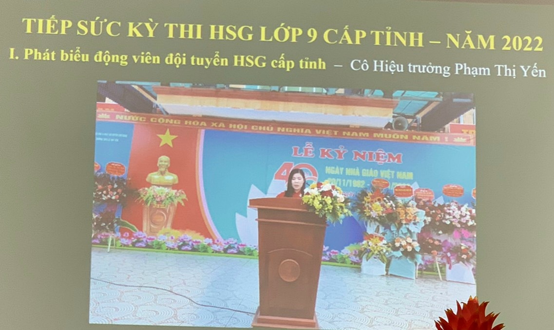 Buổi gặp gỡ diễn ra trong không khí cởi mở thân tình và sôi nổi. Mở đầu chương trình là lời phát biểu của cô giáo Phạm Thị Yến, BT Chi bộ, Hiệu trưởng nhà trường, đại diện cho nhà trường, không chỉ là giao nhiệm vụ mà là sự khích lệ, động viên, truyền cho các em ĐT và thầy cô phụ trách sự quyết tâm cao nhất để hoàn thành xuất sắc nhiệm vụ của kì thi HSG cấp Tỉnh 2022 – 2023.