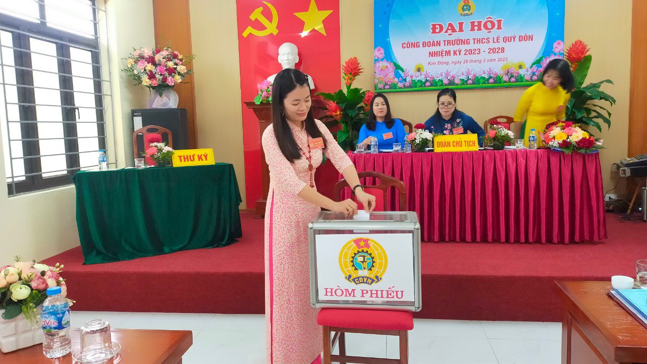 Sau thời gian làm việc khẩn trương, nghiêm túc với tinh thần trách nhiệm, hiệu quả, Đại hội Công đoàn cơ sở Trường THCS Lê Quý Đôn nhiệm kỳ 2023-2028 đã thành công tốt đẹp. Đại hội đã bầu 03 đồng chí vào Ban Chấp hành khóa mới, đồng chí Phạm Thị Thu Thủy tiếp tục được tín nhiệm giữ chức vụ Chủ tịch Công đoàn cơ sở Trường THCS Lê Quý Đôn, nhiệm kỳ 2023-2028 và bầu đoàn đại biểu đi dự Đại hội Liên đoàn Lao động huyện trong thời gian tới./.