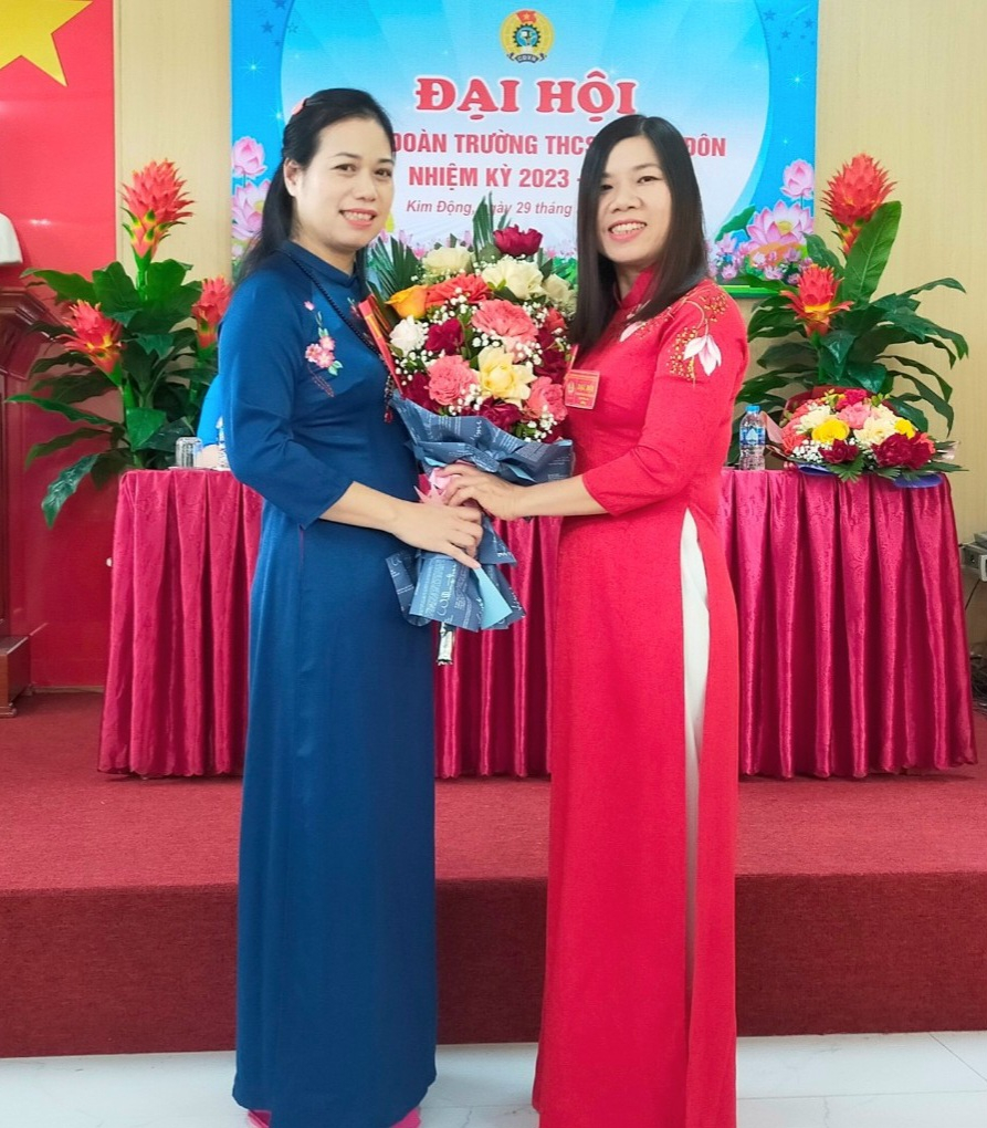 Đồng chí Trần Văn Sớm, Huyện ủy viên, Chủ tịch Liên đoàn Lao động huyện và đồng chí Phạm Thị Yến, Bí thư chi bộ, Hiệu trưởng nhà trường tặng hoa chúc mừng Ban Chấp hành khóa mới