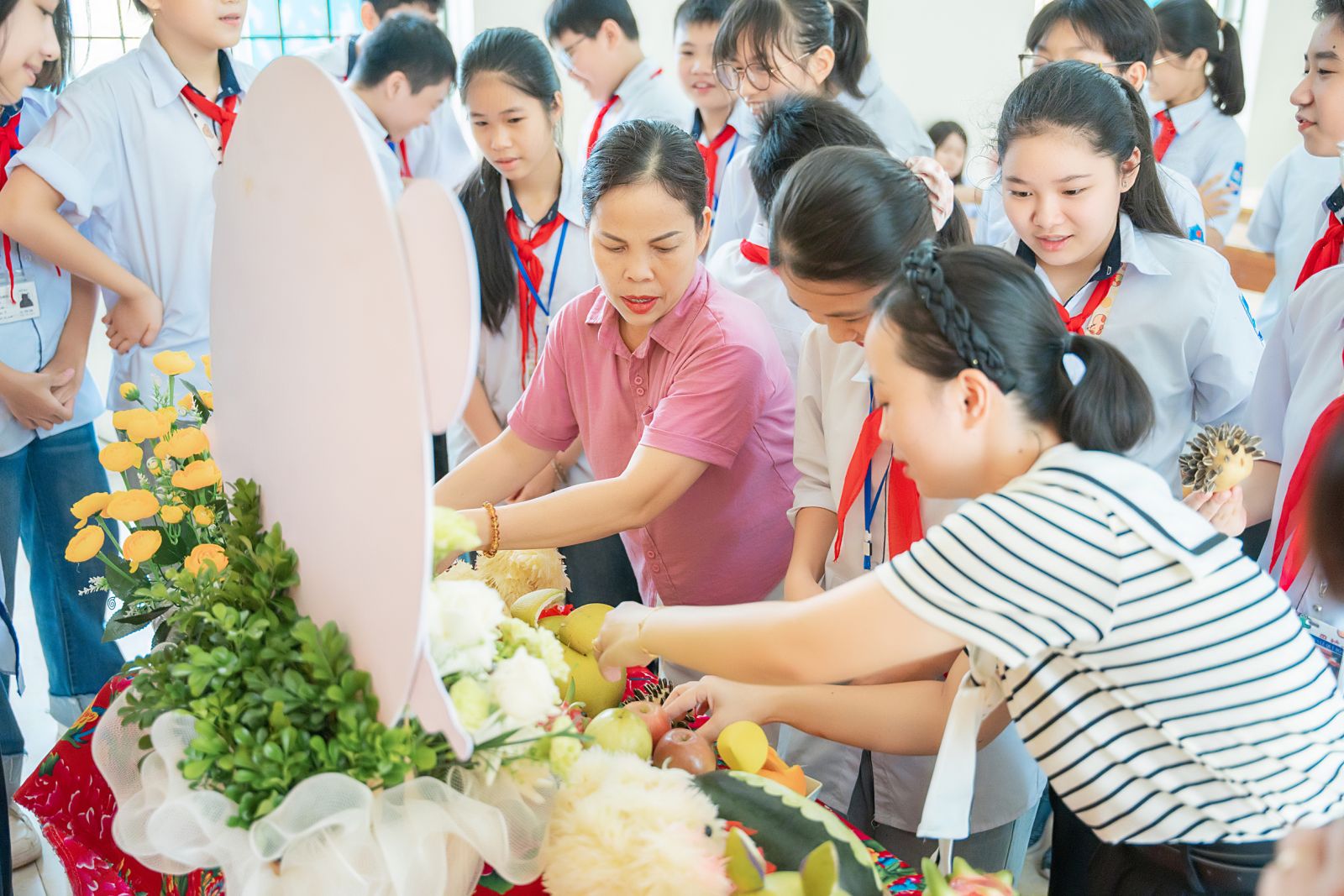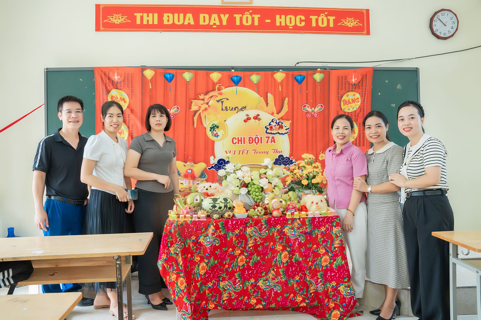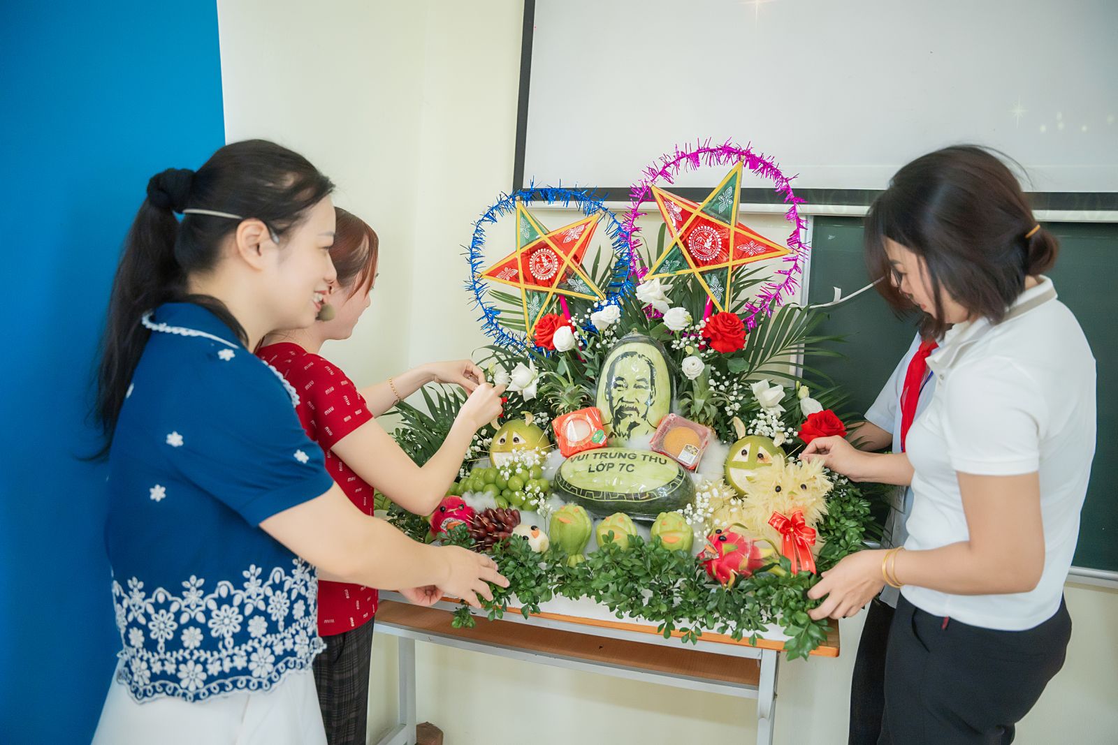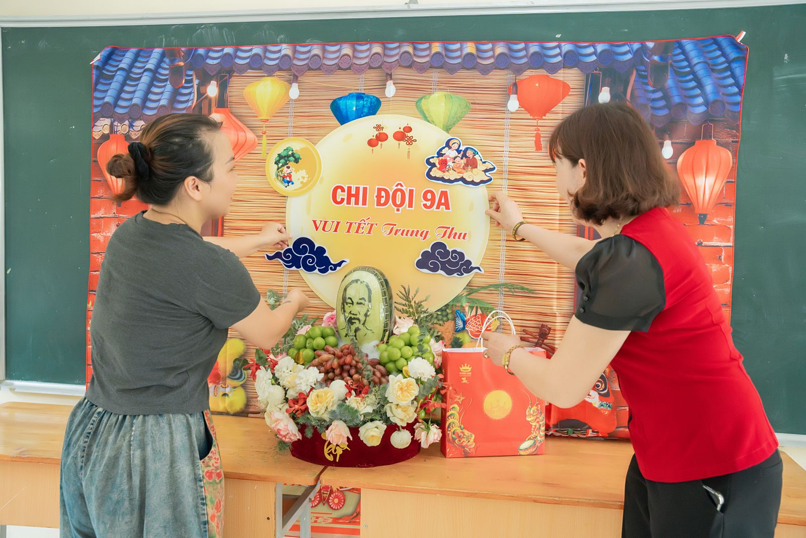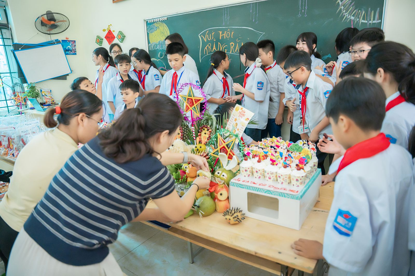 Có mẹ đã dành mấy ngày để cắt tỉa, chuẩn bị đồ trang trí mâm ngũ quả. Có bố sáng sớm đã mang mâm ngũ quả, đèn ông sao, bánh kẹo,... đến làm không khí trường con trở nên rộn ràng hơn mọi ngày.