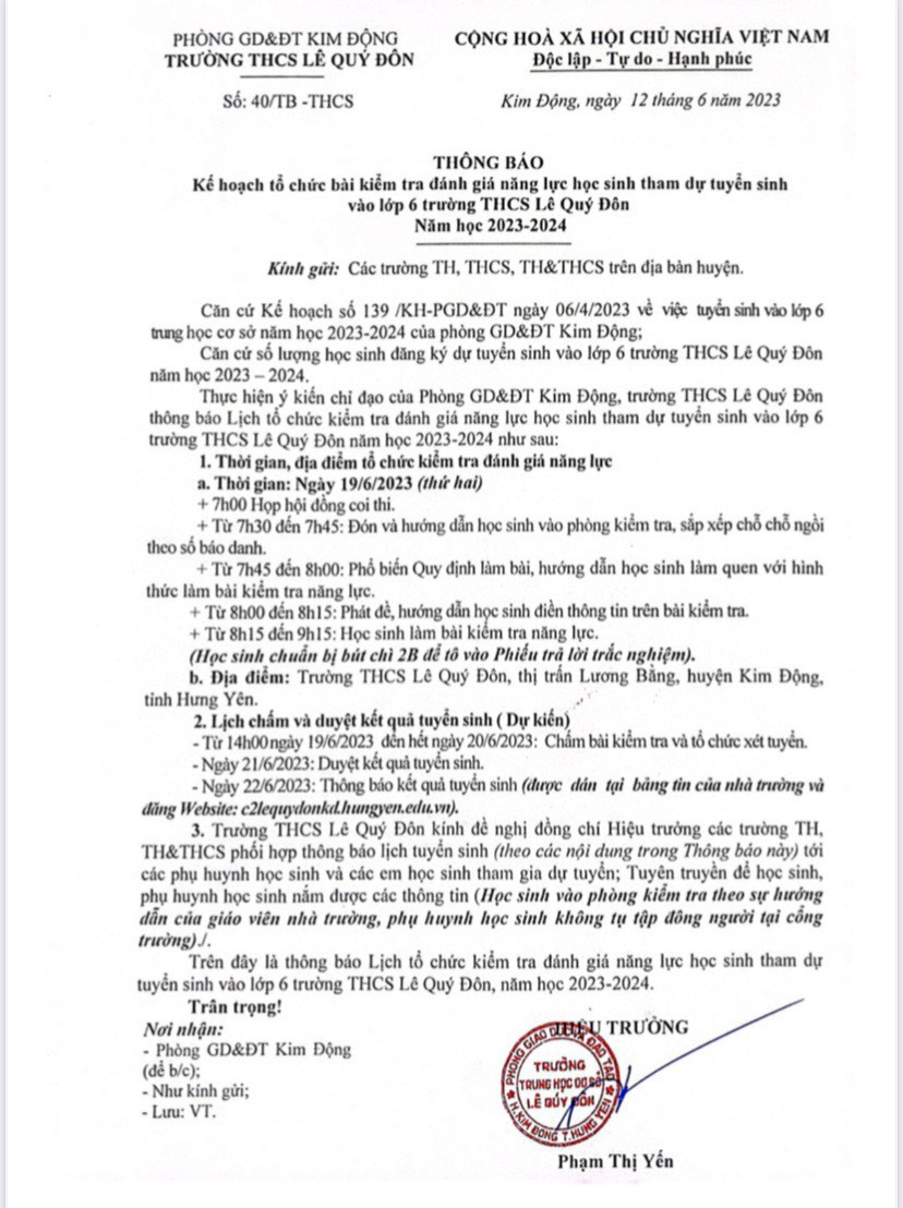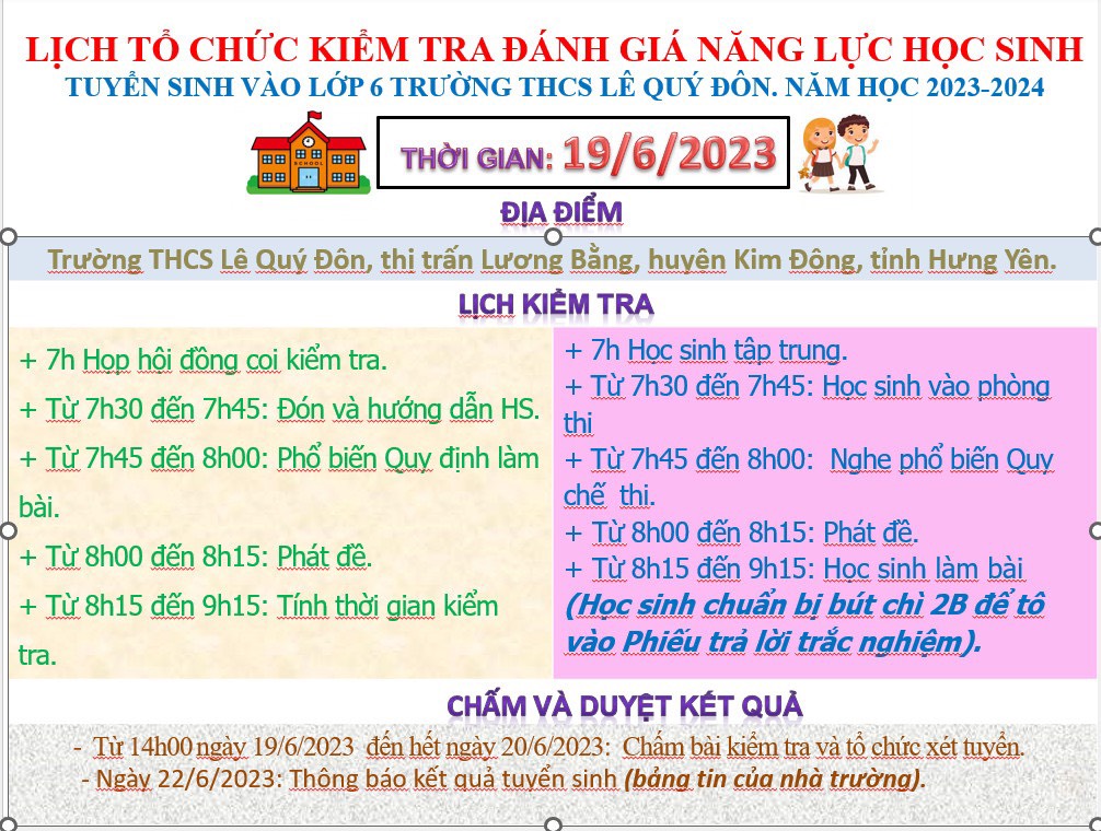 THÔNG BÁO KẾ HOẠCH TỔ CHỨC BÀI KIỂM TRA ĐÁNH GIÁ NĂNG LỰC HỌC SINH THAM DỰ TUYỂN SINH VÀO LỚP 6 TRƯỜNG THCS LÊ QUÝ ĐÔN. NĂM HỌC 2023 - 2024