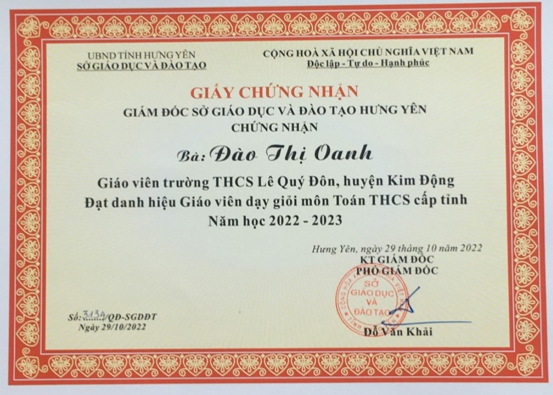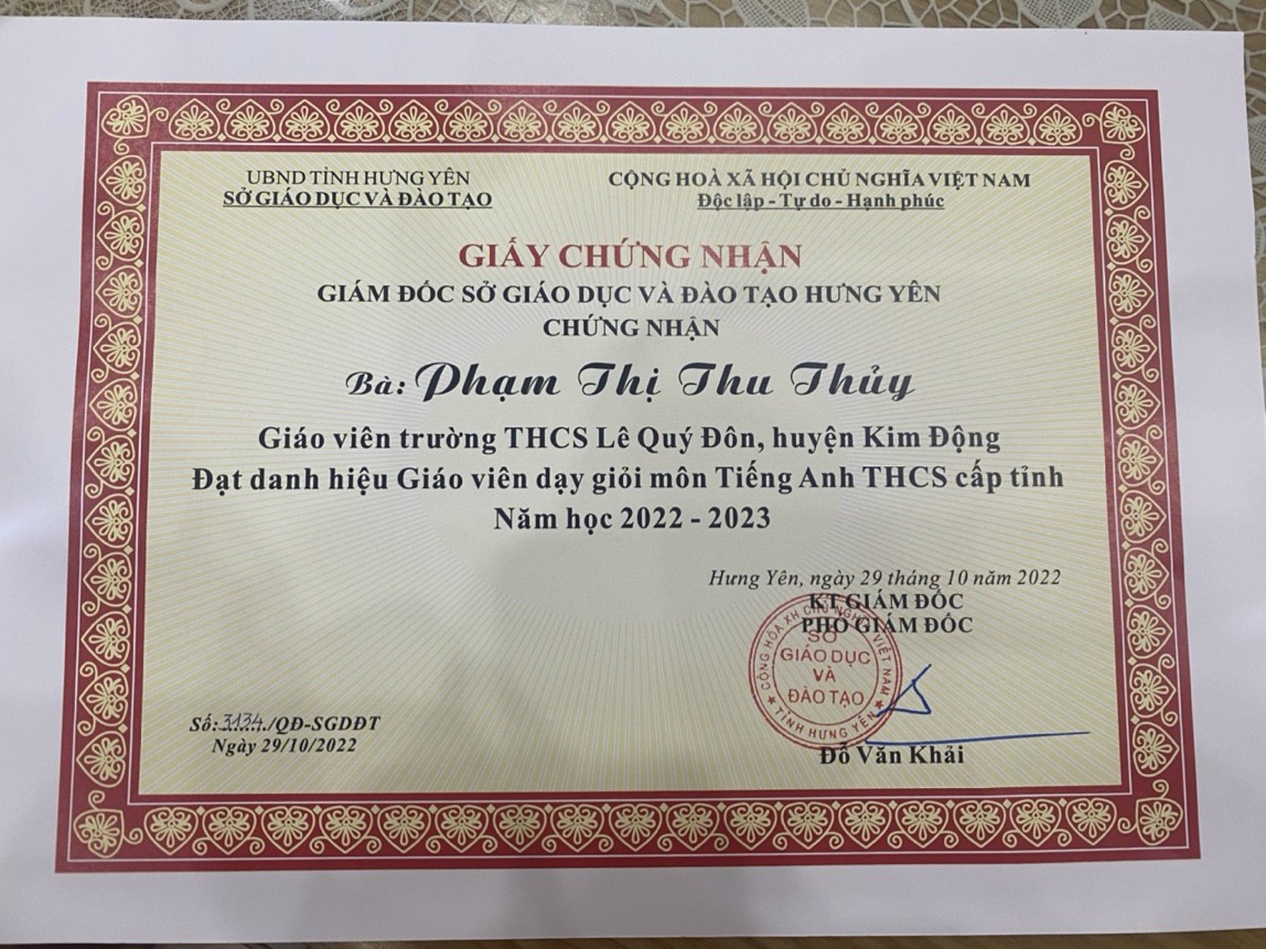 Trường THCS Lê Quý Đôn có hai giáo viên tham dự, cô giáo Phạm Thị Thu Thủy dự thi môn Tiếng Anh và cô giáo Đào Thị Oanh dự thi môn Toán. Với sự cố gắng của bản thân, sự hỗ trợ, động viên của đồng nghiệp, cả hai cô giáo đều được Sở GD - ĐT Hưng Yên công nhận là giáo viên dạy giỏi cấp tỉnh. Hy vọng rằng, sau Hội thi các cô sẽ tiếp tục phát huy tốt nhất năng lực chuyên môn của mình trong hoạt động giảng dạy tại trường, góp phần cùng với tấp thể HĐGD nhà trường hoàn thành tốt nhiệm vụ năm học.