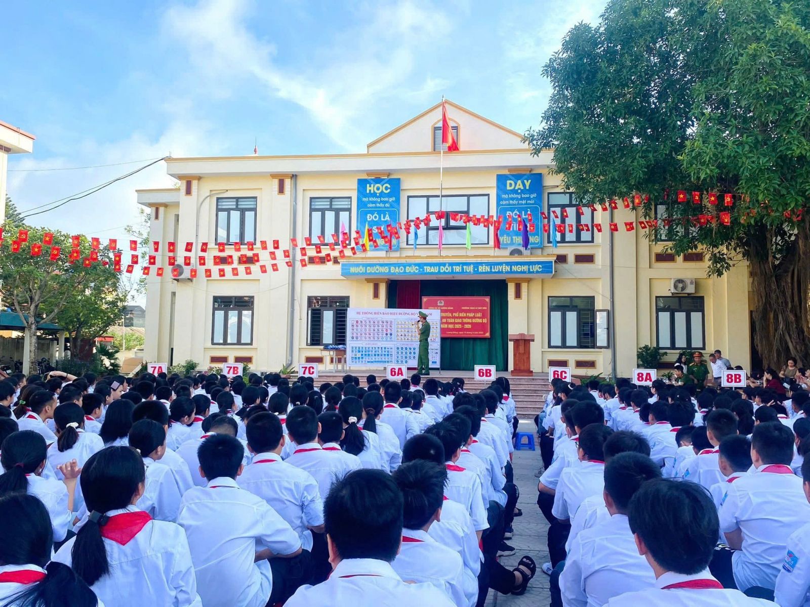 Học sinh toàn trường đều tập trung cao độ lắng nghe các chú công an phổ biến những kiến thức và quy tắc cơ bản. Mỗi lời giảng đều nhấn mạnh tầm quan trọng của việc chấp hành đúng luật, từ đội mũ bảo hiểm đến việc nhường đường, chấp hành các biển váo giao thông... để mỗi chuyến đi học, đi chơi đều an toàn.