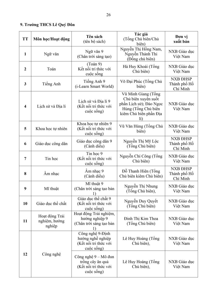 Danh mục SGK lớp 9 sử dụng trong trường THCS Lê Quý Đôn từ năm học 2024-2025.