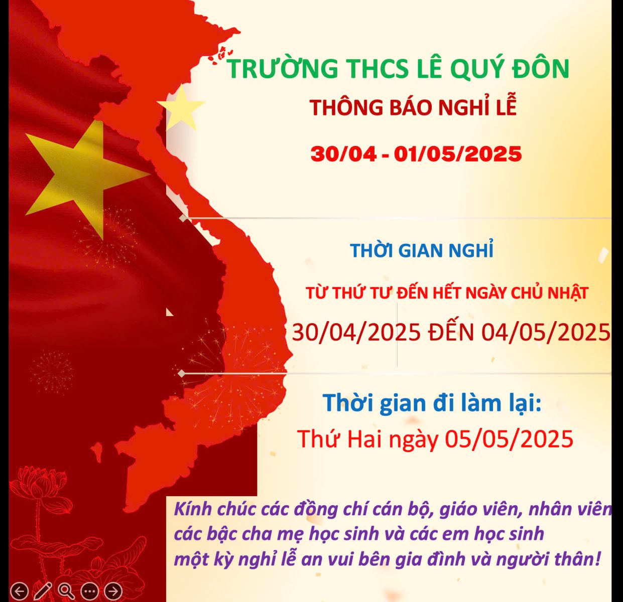 TRƯỜNG THCS LÊ QUÝ ĐÔN THÔNG BÁO NGHỈ LỄ 30/4 - 1/5/2025